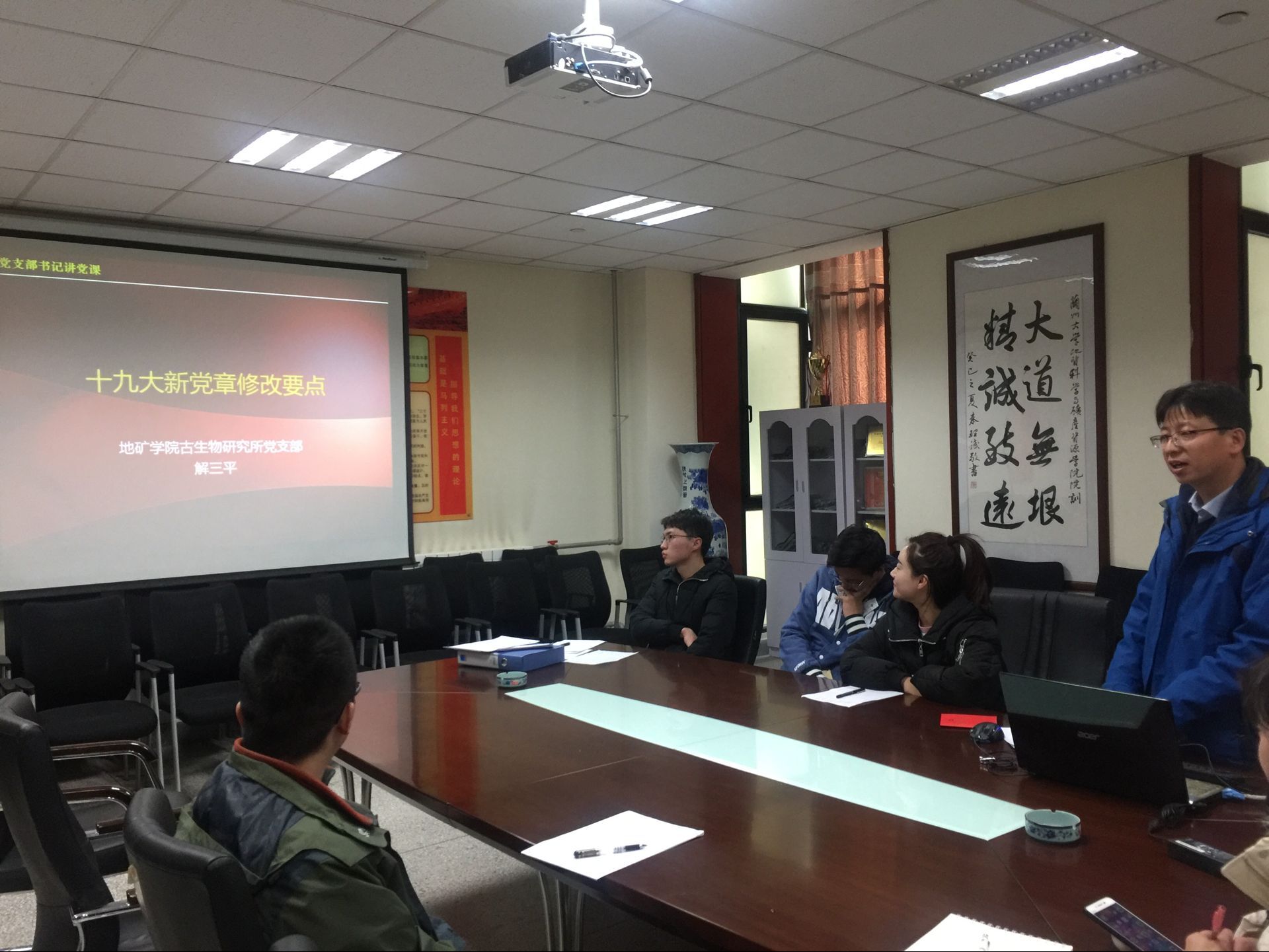 会议第三项,为贯彻党的十九大精神实施方案,讨论如何科学的学习和宣传十九大精神,古生物研究所党支部召开专题组织生活会。书记指出,党的十九大是在全面建成小康社会决胜阶段、中国特色社会主义进入新时代的关键时期召开的一次十分重要的大会。作为中国共产党的一名党员,充分认识党的十九大开创性、里程碑和划时代的重大意义,准确领会把握党的十九大精神的思想精髓和核心要义是科学宣传十九大精神的根本基础。其次,我们要自觉用十九大精神、习近平新时代中国特色社会主义思想武装自己的头脑,不忘初心,时刻牢记使命,用实际行动感召身边的同事、同学,身体力行发挥党员的先锋模范作用。